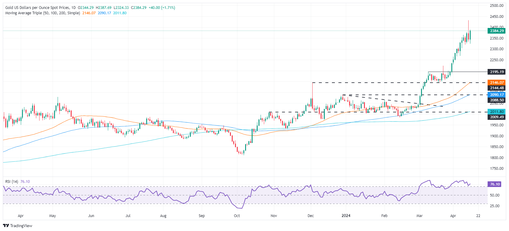 周一(4月16日),现货黄金收盘飙升逾1%,并站上2380美元/盎司关口。以色列媒体报道称,以色列空军已经完成即将对伊朗发动袭击的准备工作。FXStreet分析师Christian Borjon Valencia最新撰文,对金价走势进行分析。