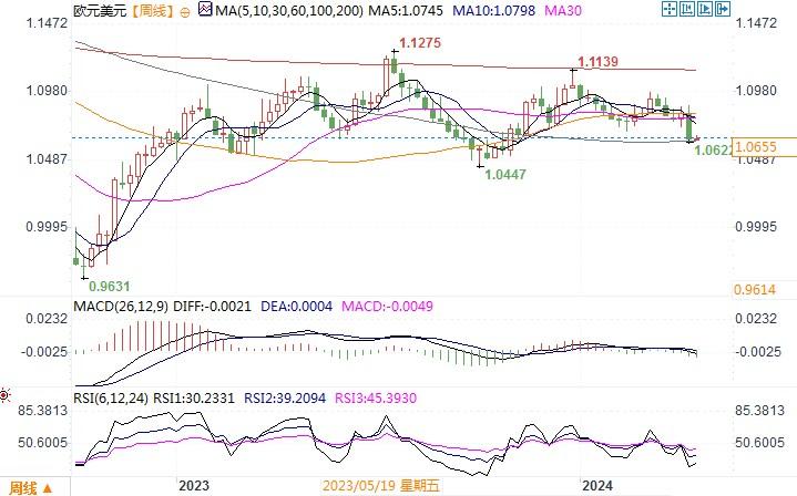 Mialich指出,预计今年美联储的总宽松幅度约为45个基点,而年初预计为150个基点。“另一方面,欧洲央行6月份的降息几乎已被市场完全消化。因此,市场相信,欧洲央行可能会先于美联储启动一个宽松周期,而且力度可能会更大,因为欧元区远期利率现在暗示,今年将降息近80个基点。”他补充道:“鉴于这种降息前景,欧元兑美元跌破1.07,暂时将保持疲软。在这个关键时刻,即便是向1.08的回升看起来具有挑战性,除非投资者重新考虑美联储比欧洲央行更大力度的宽松政策,但目前看来不太可能。”FXPro的高级市场分析师Alex Kuptsikevich认为欧元兑美元下一个可能触及的水平是1.05。