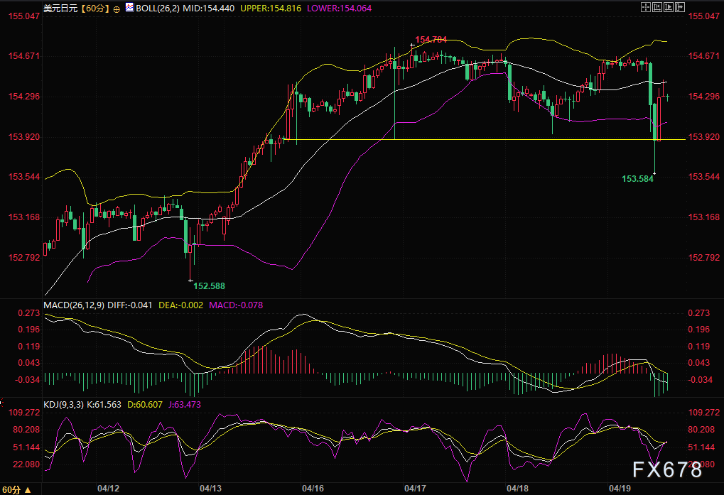 周五(4月19日),美元/日元短线一度跌穿154,最低触及153.58后反弹,目前跌幅收窄,回升至154.30附近。伊朗核设施城市传出爆炸声,提振避险日元。日本央行行长植田和男警告,日元疲软可能会影响趋势通胀,并可能导致政策转变“再次加息”。