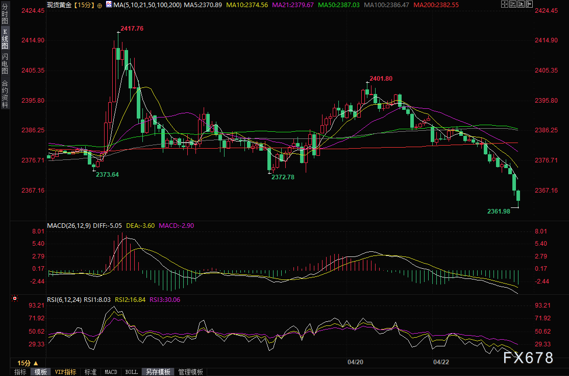 ——周一(4月22日)亚市,现货黄金震荡下跌,最低触及2361.98美元/盎司,较上周五收盘价下跌近30美元,因市场对中东矛盾升级的担忧情绪降温,而美国国债收益率走高给美元计价的黄金带来压力。