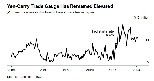自美联储于2022年3月开始大举加息以来,外国银行在日本向其主要办事处发放的贷款——这是日元融资套利交易需求的一个关键指标——一直处于高位。美联储加息扩大了日本和美国之间的政策分歧。