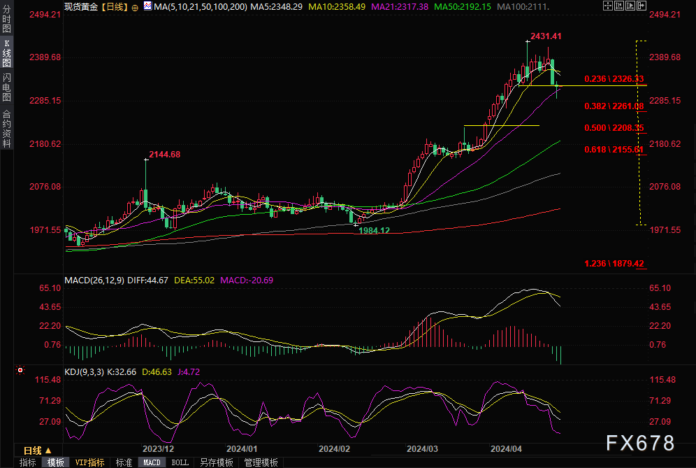 金价周二稍早曾触及4月5日以来最低2291.37美元/盎司,但尾盘收复大部分跌幅,收报2321.91美元/盎司,跌幅约0.2%。