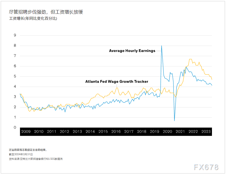 有了更多的工人,企业可以在不提高工资的情况下雇佣更多的人。事实上,虽然工资增长速度快于新冠疫情前,并与通货膨胀保持同步,但尽管招聘强劲,工资增长却有所放缓(如下图所示)。这种情况有助于美国经济更快地增长,而不必过于担心工资-价格螺旋上升可能会导致通胀失控。