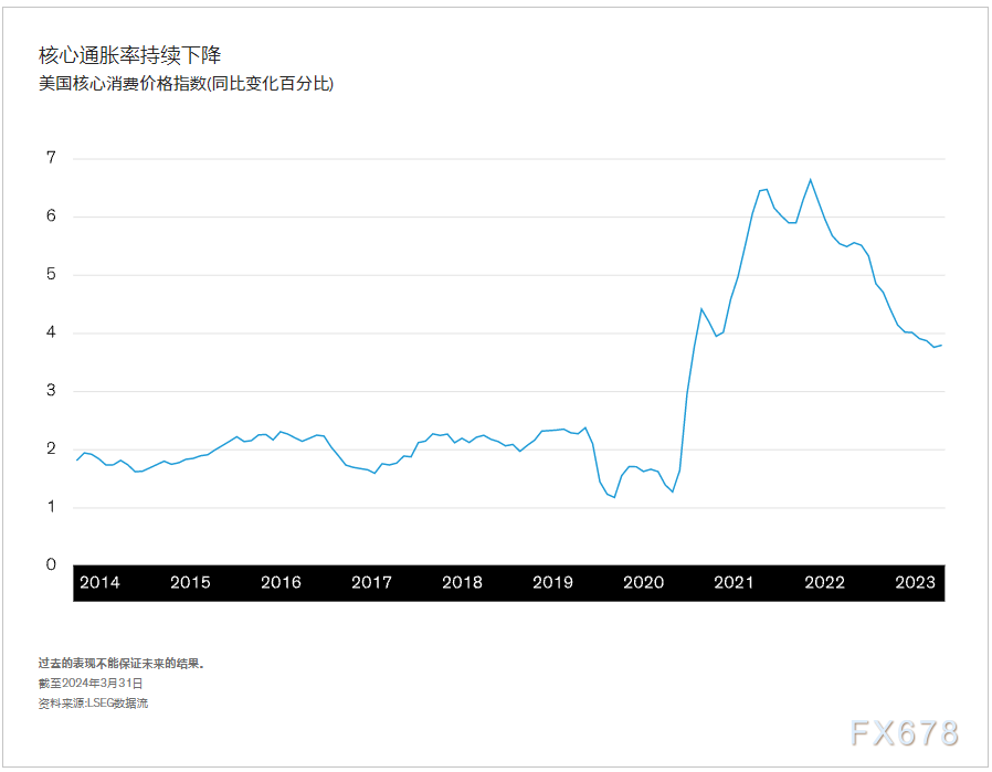 当然,增长只是等式的一部分。更大的劳动力供应量有助于抑制长期通胀,而工资增长的持续减速表明,没有理由长期担心工资-价格螺旋上升。第一季度通货膨胀率继续下降(如下图所示),尽管比我们预期的要慢。我们认为,核心通胀率要到2025年才能回落至2.0%。这应该不会让投资者感到恐慌:没有人会欢迎快速实现这一目标所需的急剧衰退。