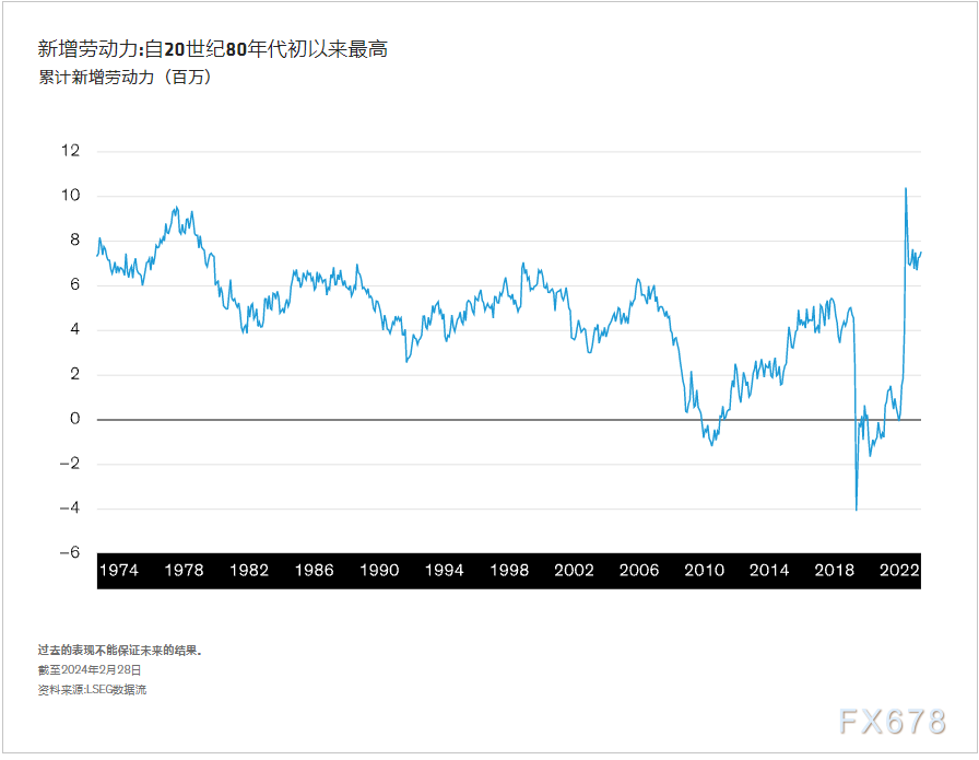 是什么推动了过去几个季度的强劲增长?它对前景有何影响?去年刺激经济增长的许多因素,包括财政刺激、储蓄储备和通胀快速降温正在消退。但净移民流动在2023年激增,这似乎是可用工人供应大幅增加的原因:在过去三年中,新劳动力进入者的数量达到了自20世纪80年代初以来的最高水平(如下图所示)。