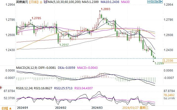 与此同时,英镑兑美元汇率进一步下跌0.5%,至1.2299,为2023年11月14日以来的最低水平。