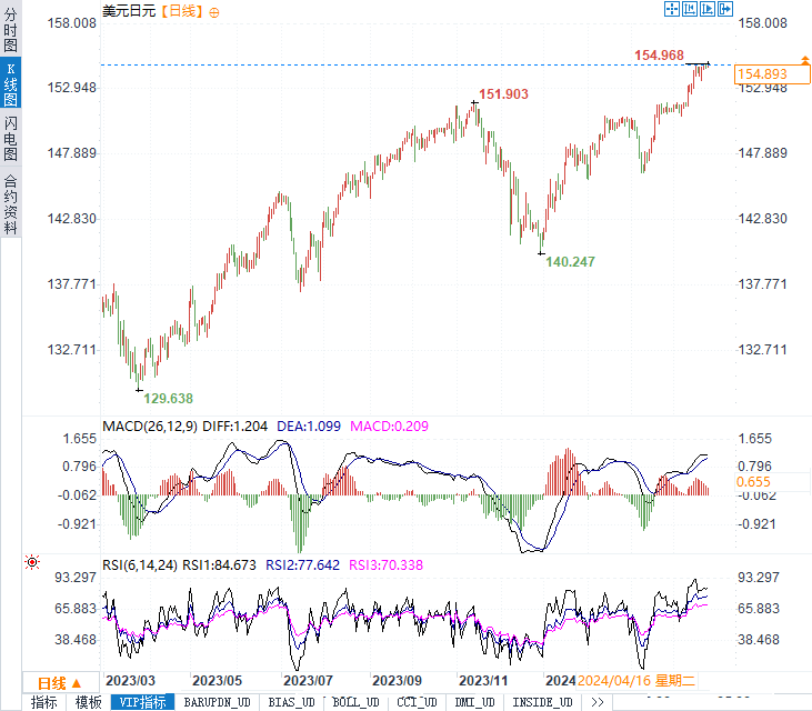 由于市场对美国近期降息的预期减弱,美元全面上涨,导致日元跌至接近155关口的34年低点,增加了日本当局干预汇市的可能性。日本财务大臣铃木俊一周二表示,上周他与美国和韩国同行举行的三边会谈可能为东京在外汇市场采取适当行动奠定了基础。这一谈话对干预的可能性发出了迄今为止最强烈的警告。
