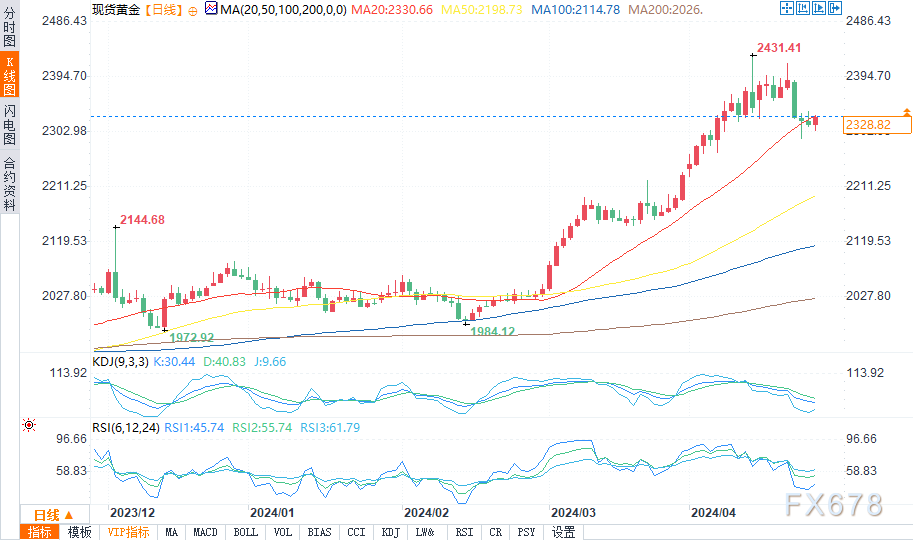 虽然市场预计美联储下次会议不会调整利率,但投资者正在关注今年晚些时候可能降息的暗示。芝加哥商品交易所集团(CME Group)的FedWatch工具追踪的市场情绪显示,美联储可能在9月前降息,这在很大程度上取决于即将公布的经济数据的趋势。此外,受获利了结和中东紧张局势缓和的影响,金价已大幅回调,从4月12日2431.29美元的高点下跌逾100美元。