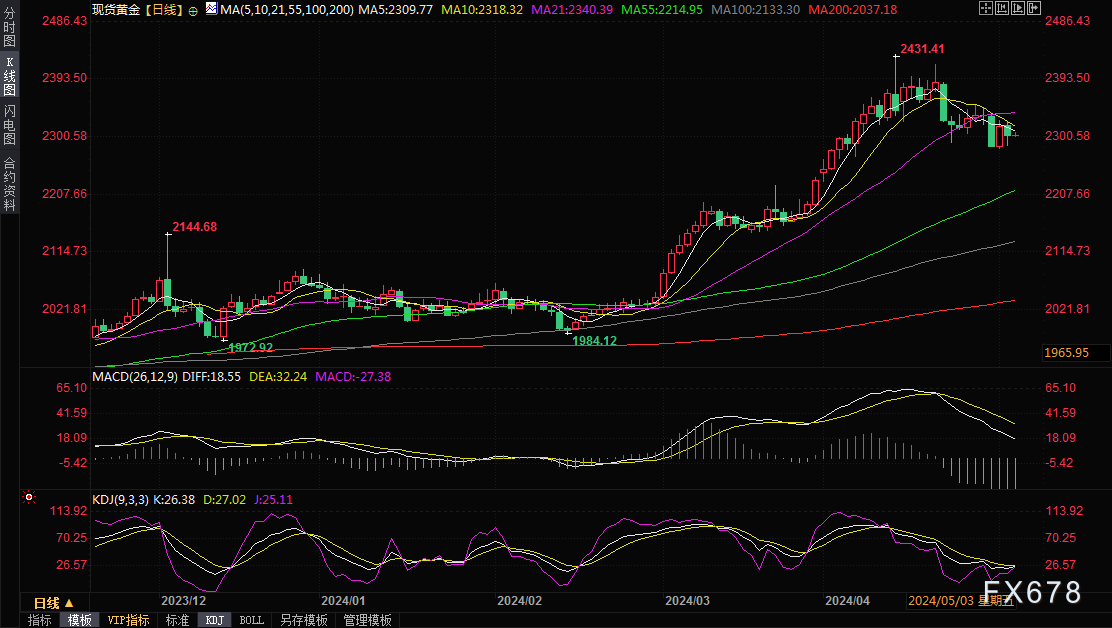 ——周五(5月3日)亚市盘中,现货黄金震荡微涨,目前金价略高于2305美元/盎司附近。FXStreet首席分析师Valeria Bednarik撰文称,由于市场参与者缺乏方向性信念,金价在2300美元/盎司附近徘徊。市场人士正在等待4月份美国非农就业报告。周四,黄金市场出现剧烈波动,纽约时段早盘现货黄金价格一度暴跌至2285.43美元/盎司,但随后金价大幅反弹,最高一度触及2309.47美元/盎司。截至周四收盘,现货黄金收报2303.49美元/盎司,当日下跌0.66%。