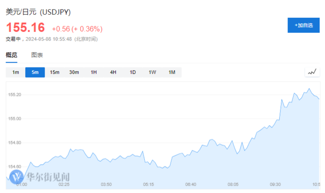 截至发稿,日元/美元短线走低逾30点跌破155,暂报155.16。