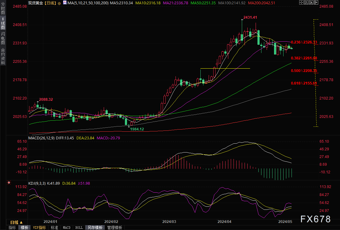 Valencia补充道,另一方面,如果买家提振金价,下一个阻力位将是4月26日的高点,即最新周期高点2352美元/盎司。一旦攻克该位,下一个目标将是2400美元/盎司大关。