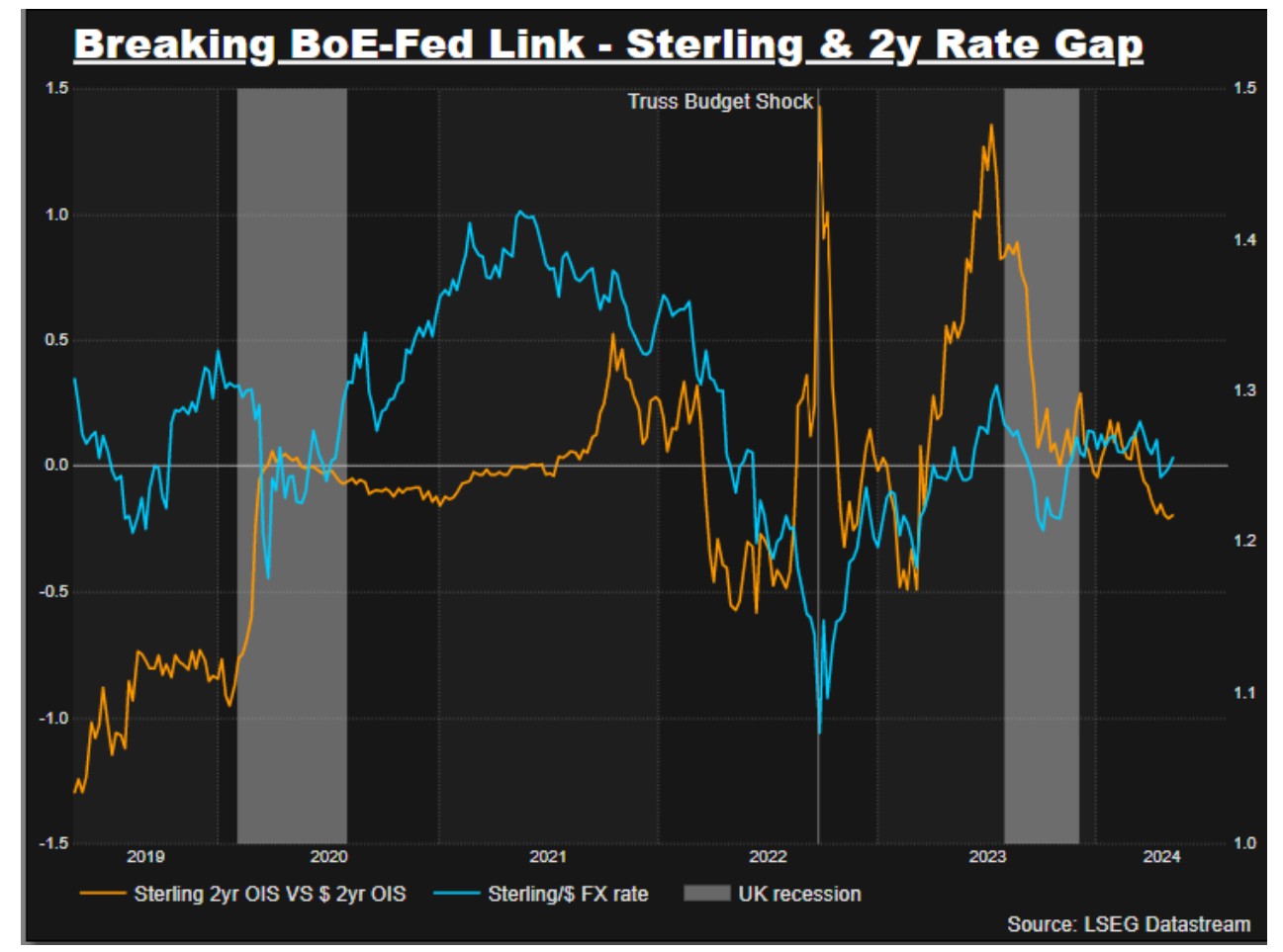 摩根士丹利团队认为,本周英国央行6月降息的大门很可能打开,他们预计英镑/美元汇率对两年期美英收益率差每下降100个基点的“敏感度”为4.5%,这将使这种情况可以忍受。