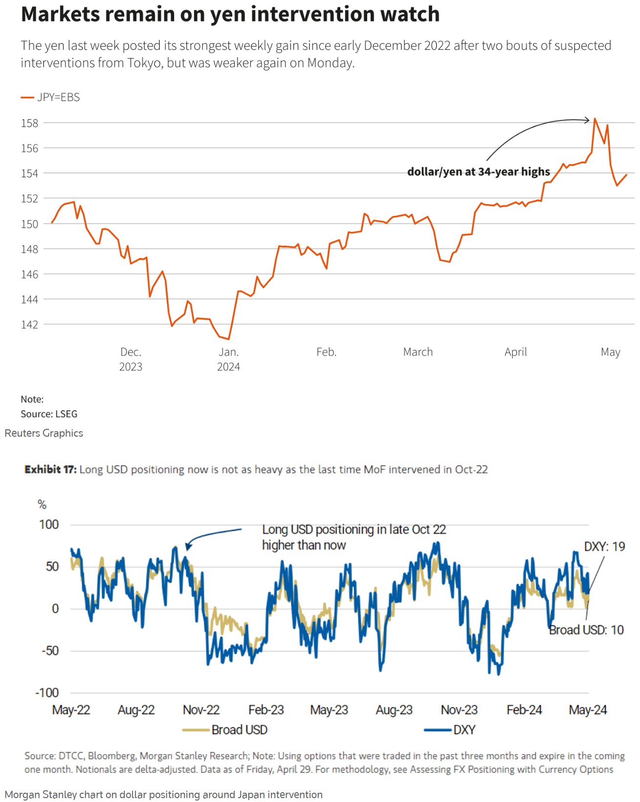 摩根士丹利策略师指出,当日本上次在2022年底出手干预美元时,美元大盘指数在接下来的三个月里下跌了10%。美元兑欧元的权重接近60%,兑日元和英镑的权重也分别高达14%和12%。