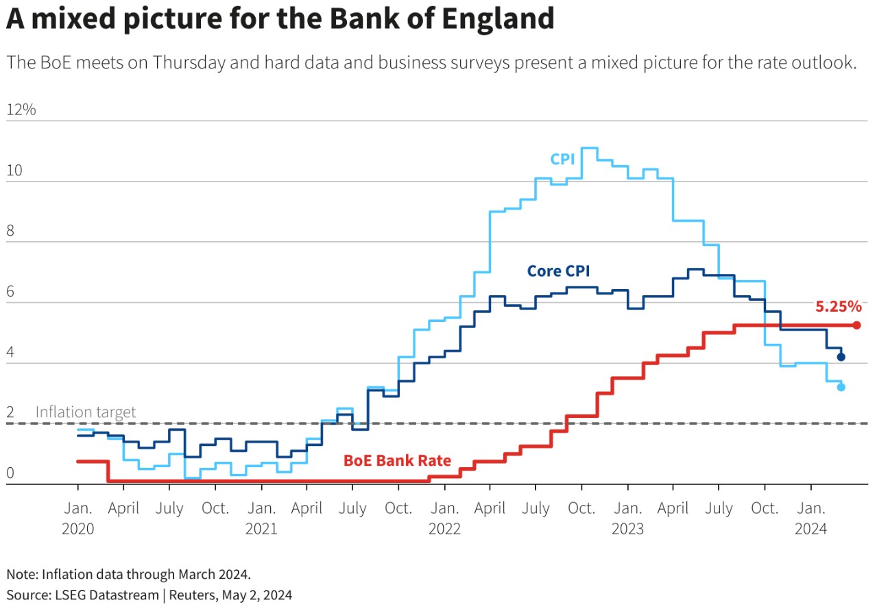 智通财经注意到,英国央行将于周四宣布最新的政策决定。虽然本周不太可能改变英国的基准利率,但有人猜测它是否会引导市场最早在下个月降息——在那两周前,欧洲央行将于6月6日公布利率决议。