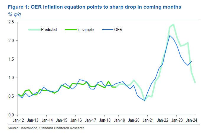 由于OER方程追踪的是最近下降的滞后私营部门市场租金数据,Englander认为OER价格通胀在接下来的几季将继续疲软。