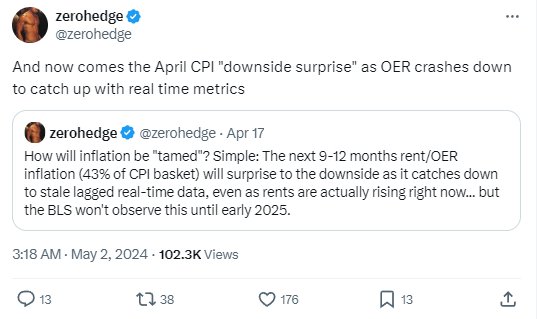 “下周发布的4月份CPI报告,将是一个‘下行惊喜’,因为滞后的业主等值租金(OER)崩溃并赶上了实时的指标。”