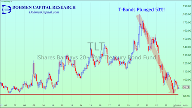 为了支持他的观点,Dohmen分享了iShares Barclays 20+年期国债ETF (TLT)的长期月度表现图表。他写道:“它在2023年末暴跌了53%,随后反弹,现在应该回到2023年的低点(红色水平线)。”
