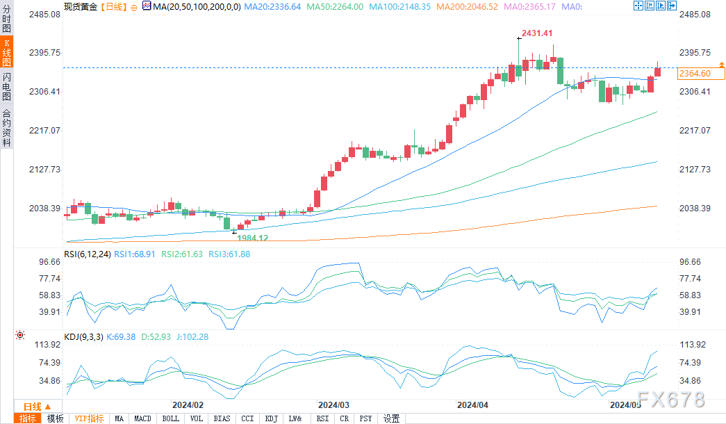 ——周五(5月10日)美盘时段,现货黄金在美国早盘交易中上涨,达到三周以来的高点。黄金本周晚些时候大幅走高,因市场认为各国央行迟早会放松货币政策。这一天,避险金属交易商显然更关注金属的消费和商业需求前景好转。现货黄金价格盘中上涨17.92美元,报2363,79美元。现货白银下降0.10美元,报28.20美元。