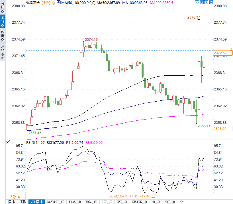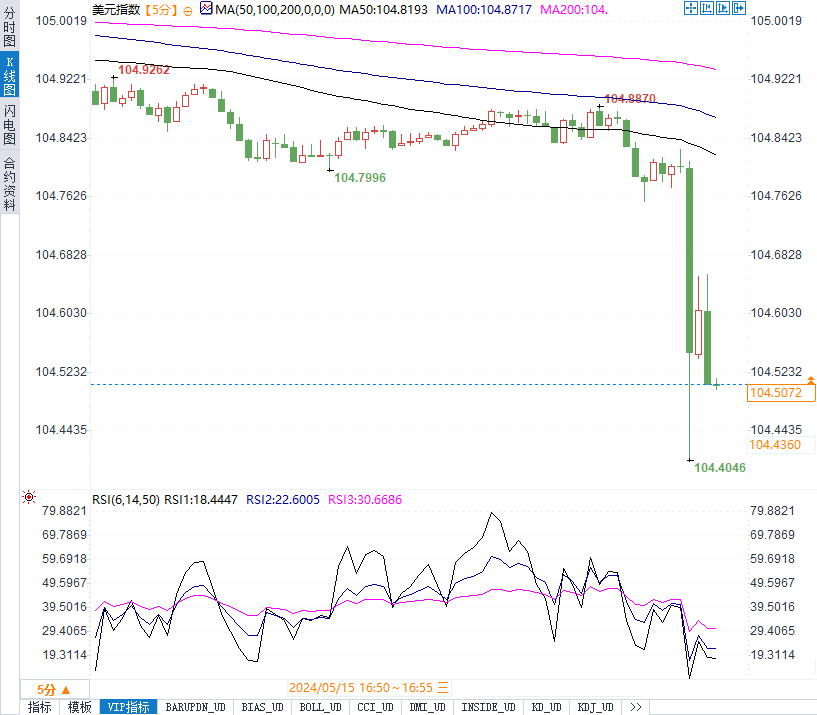 数据公布后,现货黄金短线冲高约17美元,最高触及2378.37,随后回落,现报2372.93美元/盎司。美元指数短线跳水约40点,最低触及104.4046,随后收复部分跌幅,现报104.5266。