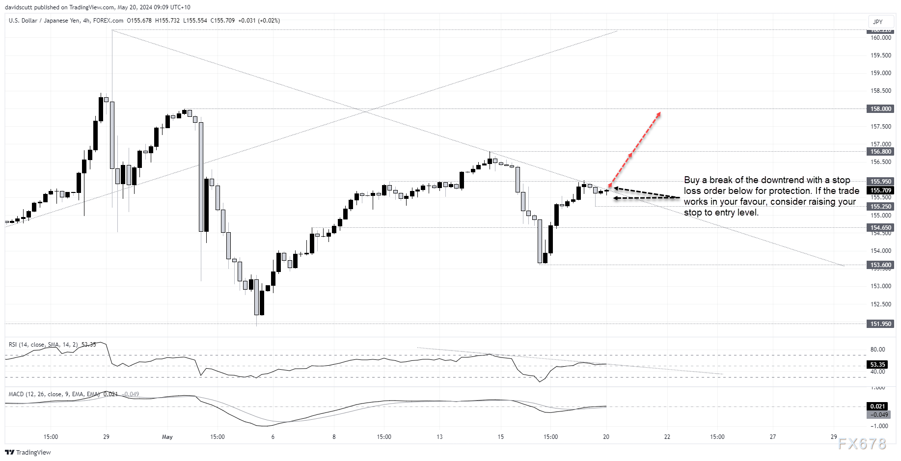 如果下跌趋势消退,交易者可以在趋势线下方设置止损单以突破买入以求保护。初步目标为水平阻力位155.95。