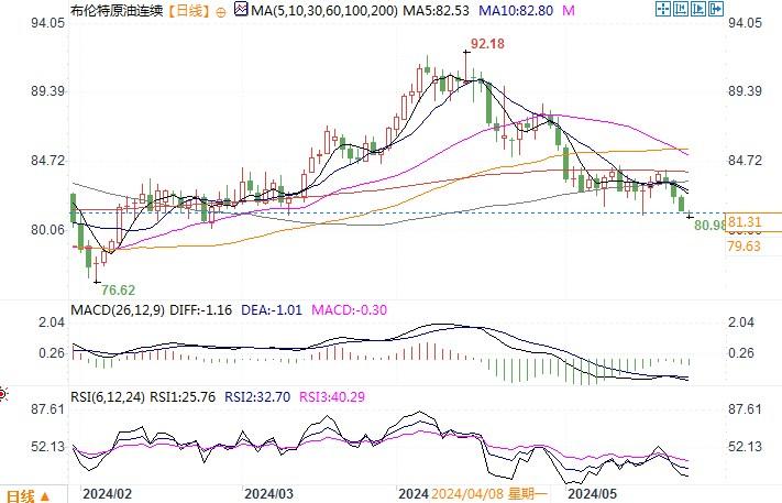 布伦特原油连续日线图来源:易汇通北京时间5月23日12:05 布伦特原油连续 报 81.31 美元/桶