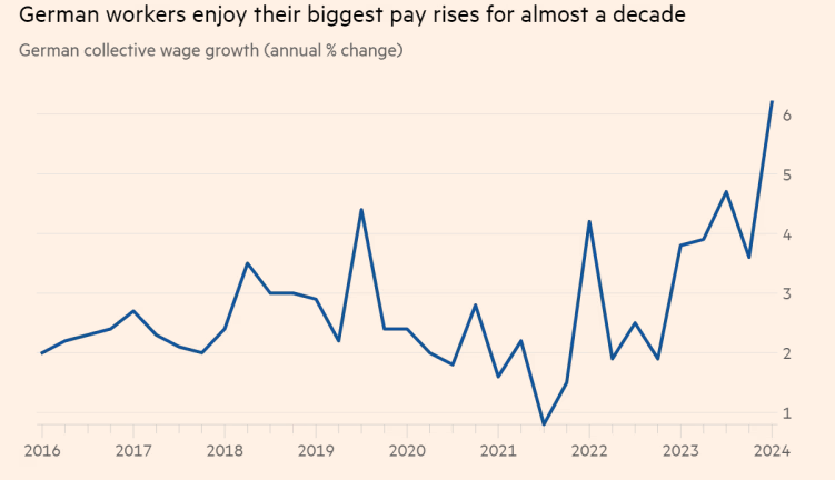 ——5月22日,市场分析师Martin Arnold撰文称,德国工资以近10年来最快的速度增长,表明整个欧元区经济正在回升,并让人怀疑欧洲央行今年将在多大程度上大幅降息。