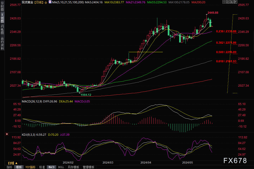 日线图来看,MACD顶背离后红色柱萎缩,KDJ高位发出超买信号后死叉,金价市场2400关口,顶破5日均线2404前,短线金价面临进一步回调风险,短线目标参考2450关口,21日均线支撑也在该位置附近。激进目标看向5月低点2277附近,布林线下轨支撑也在该位置附近。