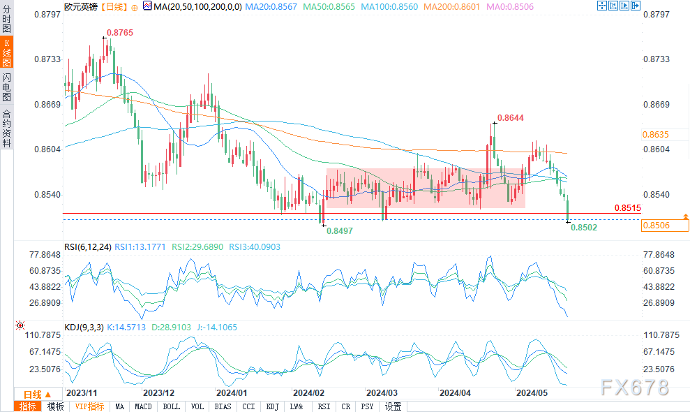 欧元兑美元已经从上周的高点回落,同时也触及了通道阻力位,因为平静的一周自然有利于美元的复苏。在CPI走低后,美元明显下跌,但由于周四和周五的价格走势仍在继续,美元几乎收复了本周所有的失地。该货币对目前正在测试通道支撑位,这是短期看跌走势的最近障碍。上行通道仍然完好无损,维持了欧元兑美元更广泛的上行趋势。如果美元反弹,欧元兑美元进一步下跌,1.0800水平和200日简单移动均线成为焦点。然而,如果更广泛的上升趋势继续下去,1.0900将成为阻力位。德国制造业PMI和密歇根大学消费者信心报告似乎是本周结束前的潜在市场推动因素。在英国CPI数据公布后,欧元兑英镑下跌