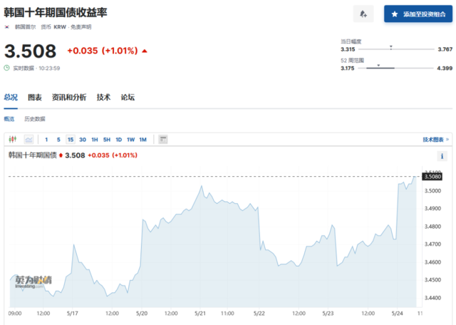 韩国10年期国债收益率报3.508% ,上涨3.5个BP 。
