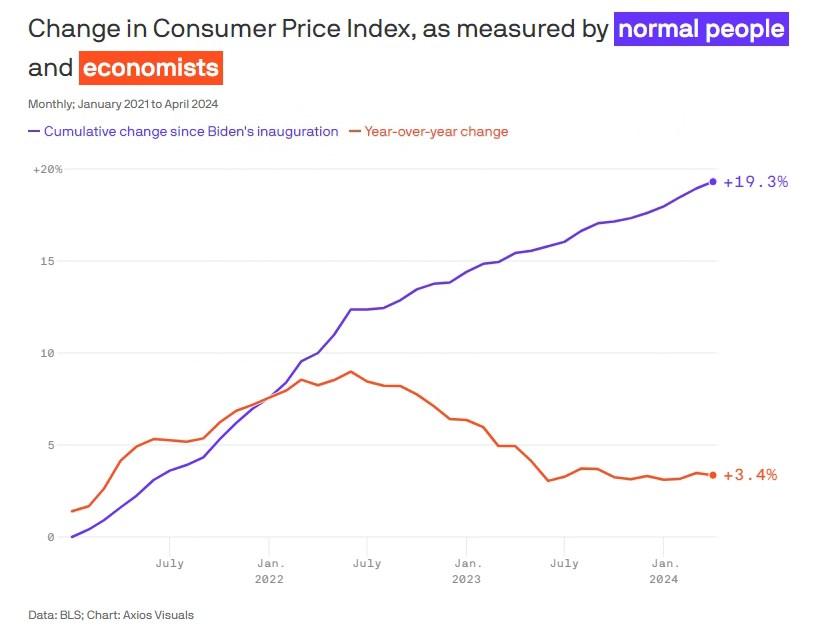 图:普通人(蓝线:自拜登上任以来的累计变化)和经济学家(红线:同比变化)理解的CPI变化(从2021年1月至2024年4月月度数据)