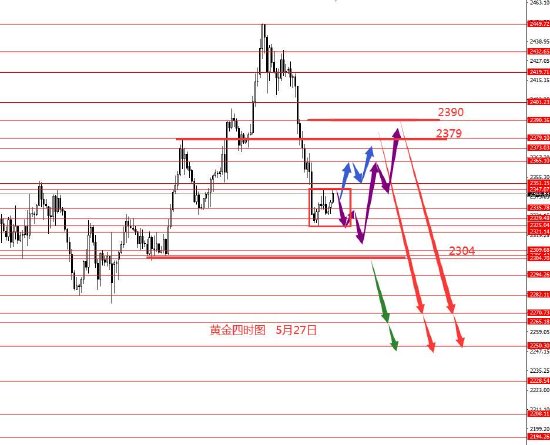 黄金上周2400上方震荡完后向下破位并深跌,分析错误。从图形来看,黄金回调力度较大,虽然视频解盘的备选方案是深踩2365,但实际走势也远超预期,所以后市大概率还要再跌一波,上方关注2379和2390区域强阻力,反弹后中线下个波段看空至2270和2250区域,大概率这是下个月的行情了。本周关注2300-2390区间震荡行情,今日先关注周五盘整的高低点,若向上破周五区间,大概率会走蓝线,小幅震荡向上修整;若周五高点没上破前,也有可能再承压跌一下,创了新低再反弹上来,走紫线探低后向上反弹修整,下个波段主抓的仍是红色箭头线行情,目前绿线概率最小。周初关注蓝线或紫线的修整行情吧。今日只是框架思路,没有具体操作建议。