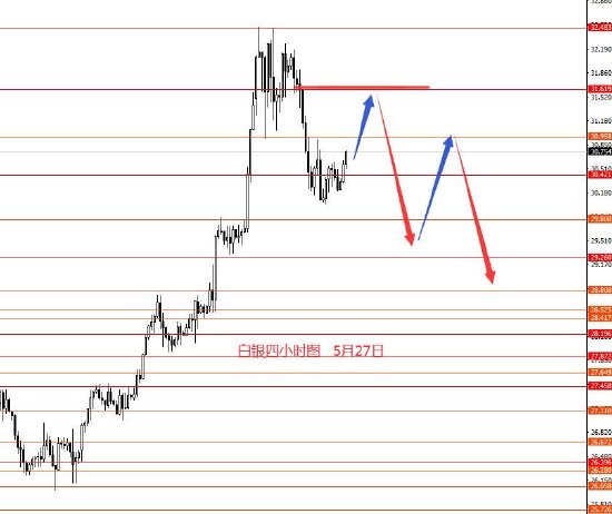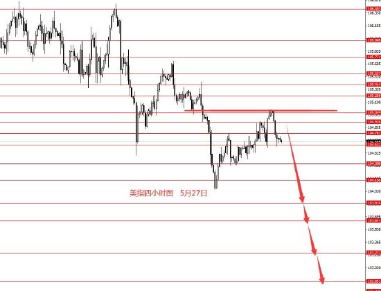 5月27日,上周美指冲高回落,周图收小阳柱。从图形来看,前期框架思路延用即可,后市105.10以下继续看空,上周有空单的继续持有即可。本周操作建议:104.80附近做空,止损105.50,目标看向103.60和103.20,再看向102.80,极限101.70区域。控制仓量,严格止损。