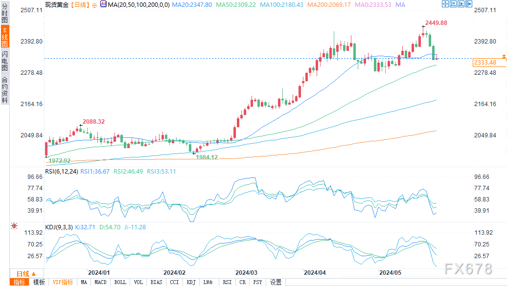 本周晚些时候金价暴跌。纽约商品交易所(Comex)6月黄金期货较周一2,454.20美元的纪录高点下跌逾100美元。一个不祥的看跌双顶反转形态已经在6月黄金日线图上形成。这表明近期市场已经见顶。这是贵金属市场对周三下午公布的联邦公开市场委员会会议纪要对美国货币政策略微偏鹰派倾向的反应。