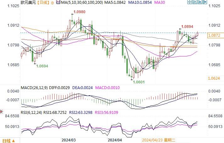 ——分析师预计欧元兑美元将在5月24日开始的一周内保持建设性,但欧元区和美国的通胀指标将导致本周末的交易波动。上周欧元兑美元录得六周来的首次周跌幅,但这只是看涨设置的一个小瑕疵。欧元兑美元处于短期上升趋势,上周五在低点1.08区域交投,成功守住1.08低点,未来几天可能延续上涨。