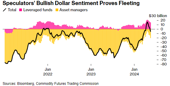 周一(5月27日),随着有迹象表明美国经济正在降温,对美元的看涨情绪正在迅速消退,一批投资者六周来首次持有净空头仓位。