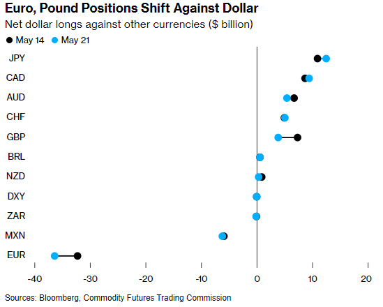 5月14日至5月21日期间,美元兑几乎所有G10货币均走弱,导致彭博美元现货指数下跌0.4% 。当周,投资者增加了对欧元的美元净空头仓位,同时减少了对英镑的看涨押注,导致美元整体仓位发生转变。美元/日元的净多头仓位仍在增加。
