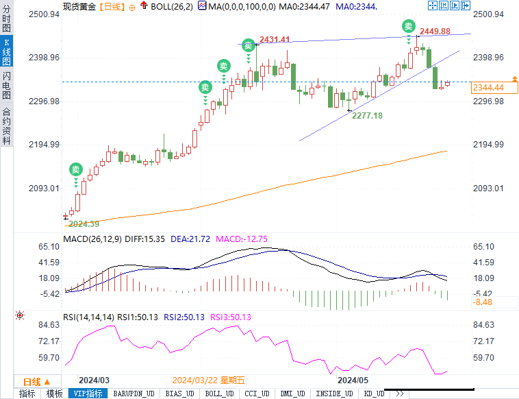 支撑位:2313美元/盎司的50日移动均线是一个关键的支撑位。若金价跌破这一水平,可能会进一步下探至2300美元/盎司,甚至测试5月3日的低点2277美元/盎司。