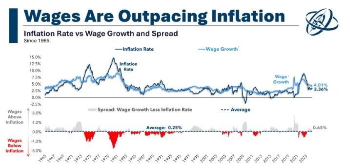 大多数时候工资增长快于物价增长,但并非总是如此。自1965年以来,工资增长一直高于通胀率略低于60%的时间。
