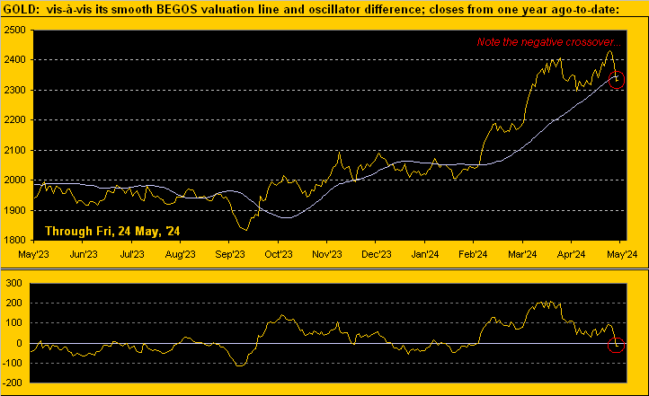 “现在我们几乎不看跌黄金,但看到价格进一步下跌也并非不合时宜,因为黄金刚刚自2月28日以来首次跌破我们的市场价值“平滑估值线”。跌破该线,无论是组成BEGOS的五个主要市场中的任何一个,即债券/欧元/黄金/石油/标准普尔,通常会导致进一步抛售,如下图所示。请注意红色圆圈中的最新负价格交叉,下面板振荡器为价格减去估值,”Mark续称。