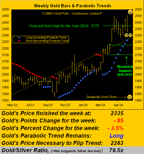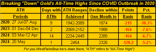 Mark指出,他在上周文中就提到,黄金价格的每日交易区间足够大,因此人们可以合理地预期,最早在上周一(5月20日)就出现新的历史新高,高于2449美元,事实也正是如此,COMEX黄金期货价格最高上涨至2454美元,但仅此而已。