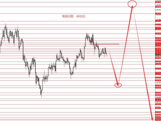 6月3日,上周美指区间震荡周图收小阴柱。从图形来看,美指已在此区域震荡两周,后市向下破位并大跌的概率较大,所以前两周的框架思路仍要延用。短线看上周正如视频解盘预期走了N字形,本周策略照旧:104.80-104.90区域做空,止损105.50,目标先看104.40和104.20区域,一旦成功跌破后便可看向103.60和102.80,极限101.70区域。波段转折点关注101.70区域,下个波段101.70-108.80的向上波段。若成功站稳105.40上方后,中线便不再看跌。控制仓量,严格止损。