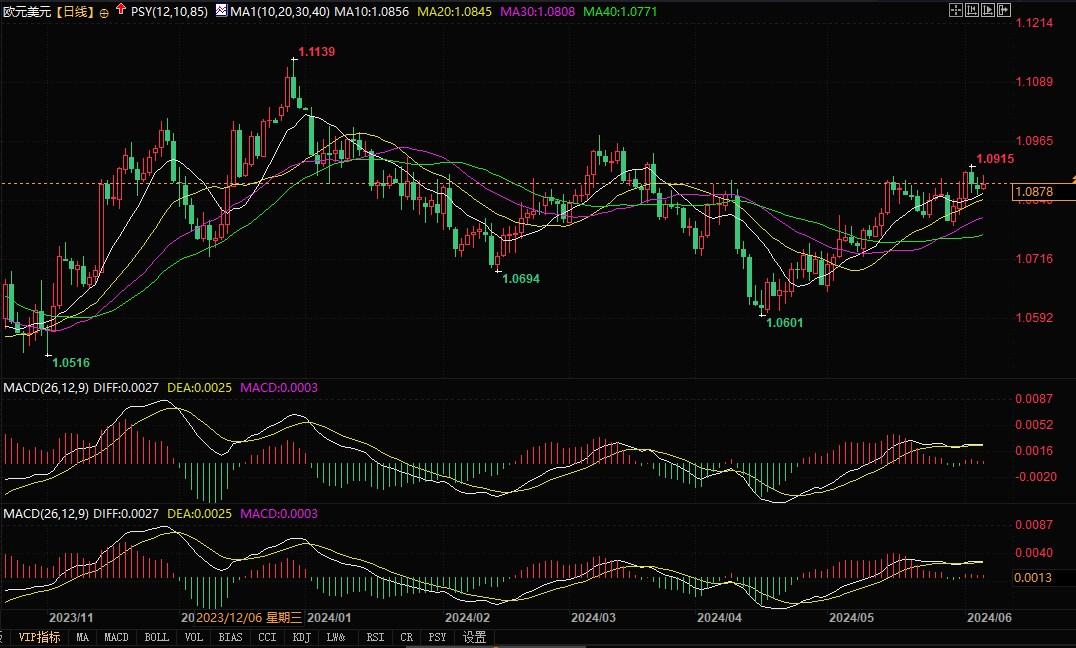 欧元兑美元日线图北京时间6月6日14:25,欧元兑美元报1.0879