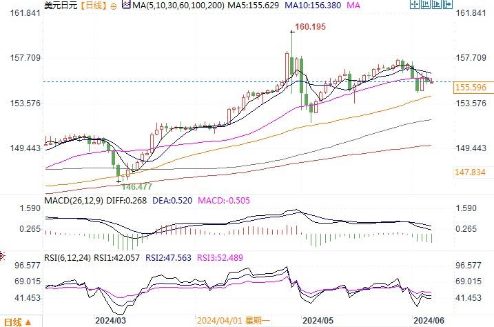 美元兑日元日线图来源:易汇通北京时间6月7日13:43 美元兑日元 报 155.62/63。