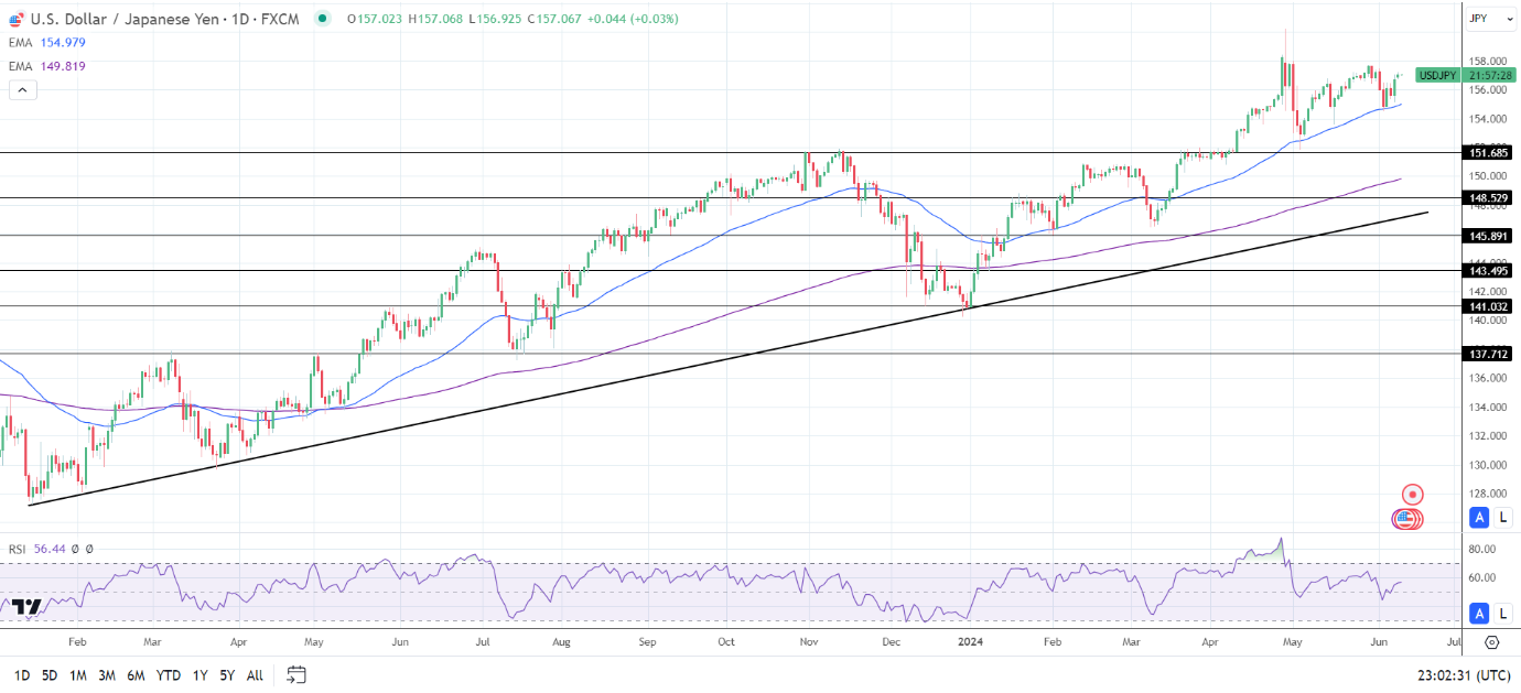 周二(6月11日),美元/日元短线上攻,升至157.23。美联储和日本央行利率决议来袭,鹰派的FOMC经济预测定价,可能会使货币政策分歧偏向美元。分析指出,美元/日元逼近看涨突破的关键水平。