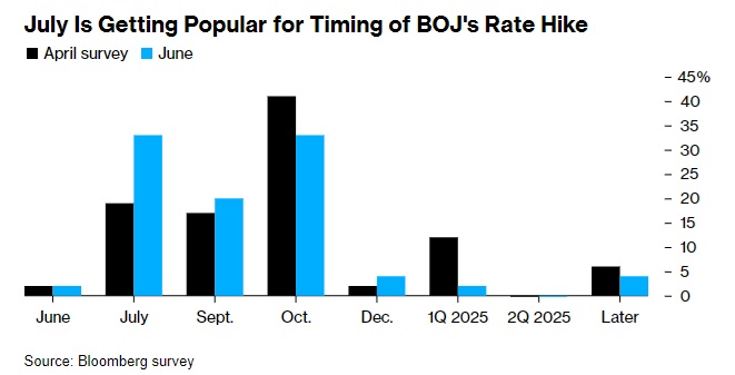 在接受彭博社调查的51位经济学家中,有三分之一的人预计日本央行7月份会加息,而在4月份接受调查时持这一观点的经济学家仅为19%。