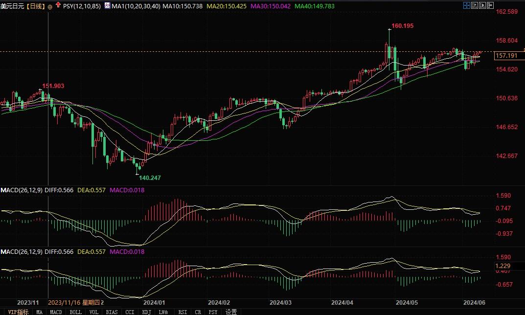 美元兑日元日线图北京时间6月11日10:27,美元兑日元报157.19/20