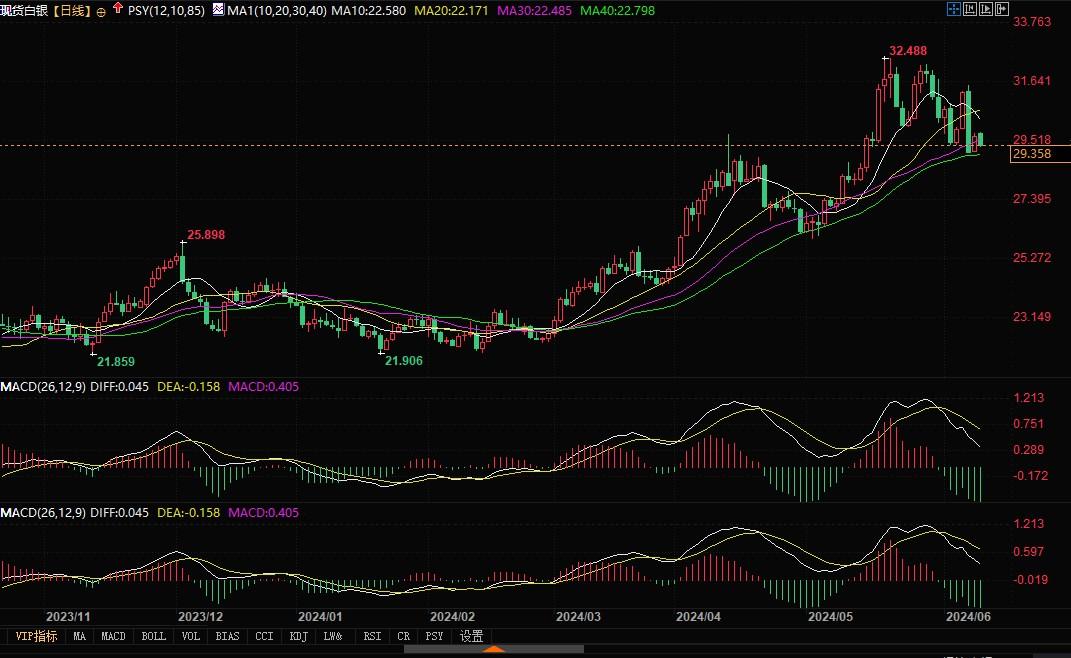 现货白银日线图北京时间6月11日9:55,现货白银报29.35美元/盎司