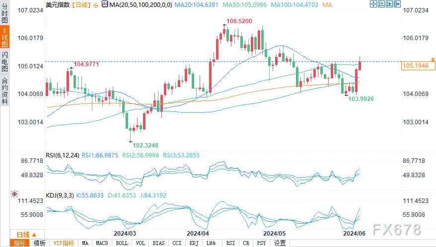 由于就业数据的持续影响,本周开始时风险偏好较低。美元对其他主要货币保持了积极的势头,推动美元指数向105关口进发。本周的经济数据,特别是CPI和美联储的决定,将对确定美元近期走势并提供有关美联储未来货币政策行动的进一步线索至关重要。市场预测,如果风险偏好减弱,美元指数可能会飙升至105.5、105.85甚至106.3的目标水平。截至发稿,美元指数已冲破105关键点,现报105.20,涨幅0.24%。
