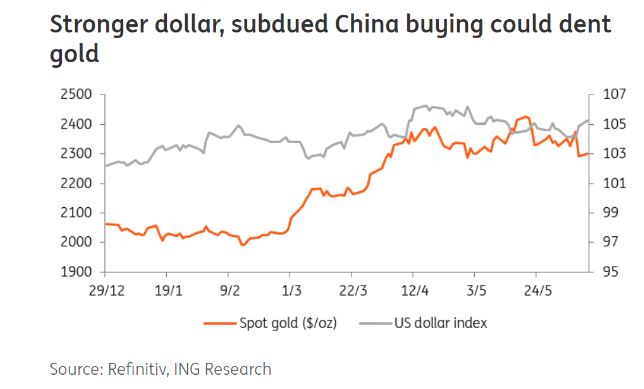 荷兰国际集团 (ING) 大宗商品策略师 Ewa Manthey 表示,金价正面临美元走强和中国需求减弱带来的新阻力,但一旦美联储开始降息,黄金将恢复上涨势头。