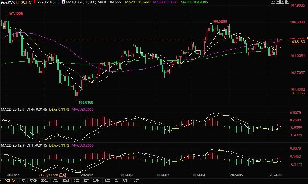 美元指数日线图北京时间6月12日9:19,美元指数报105.30